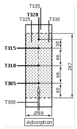 Schematic structure of the activated carbon filter with the thermocouples used (size indication in mm).