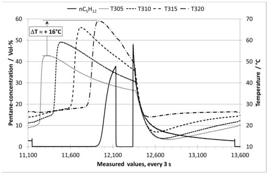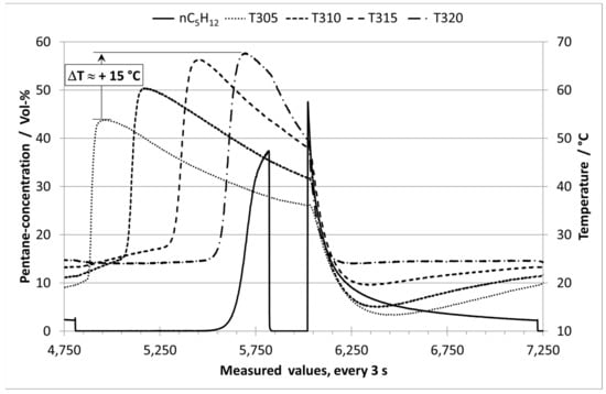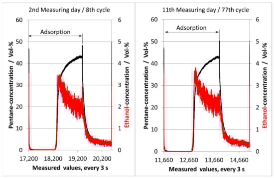 Figure 4 shows the concentration and temperature curve for the 10th cycle of long-term measurement. It is evident that the pentane initially adsorbs completely until it begins to break through after approx. 750 measuring points. After 1020 measuring points, i.e., after approx. 51 min, the maximum pentane concentration is detected. Reaching the maximum pentane concentration is followed by a holding time of 10 min. Then, desorption starts for 1 h in countercurrent with humid nitrogen loaded with 70% relative humidity. In addition, the temperature curve in the adsorber is shown using the example of four thermocouples distributed axially in the activated carbon filter. The adsorption front moves from the bottom to the top of the adsorber, i.e., initially, an evolution of heat is observed at the bottom of the adsorber (T305). Subsequently, the adsorption front moves further upwards in the adsorber so that first the thermocouple T310, T315, and finally T320, which is located at the upper end of the activated carbon bed, detect the heat tint. In the 10th cycle, the temperature difference between T305 and T320 is approximately 15 °C.