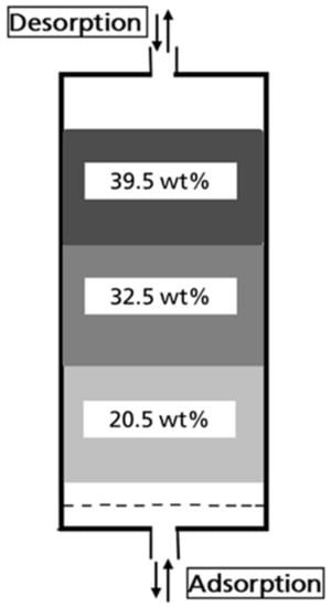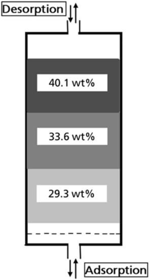 To determine the water content of the activated carbon bed, samples were taken at different heights of the filter and analyzed by Karl Fischer titration. For this purpose, activated carbon samples were taken from the bottom, middle, and top of the filter at the end of adsorption in the 300th cycle. The water content was highest at the top of the filter at 39.5 wt% and decreased towards the bottom (see Figure 7).