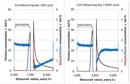 In the case of the system E10 and moist nitrogen (70% RH) as flushing gas, the following breakthrough behavior (Figure 13) over all cycles of the experiment is seen. The water breakthrough with a concentration of about 2.5 vol %, which corresponds to the partial pressure of the water at the prevailing temperature, is obvious. With the pentane, however, no ethanol breaks through here, quite in contrast to the experiment with dry flushing nitrogen.