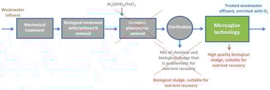 The use of algae as a tertiary treatment step has many advantages: eliminated need for the use of reagents for P reduction; eliminated recirculation of wastewater for N removal (reduced energy consumption); and improved quality of the generated excess biomass, which allows for its further application through safer nutrient utilization [8,22,23]. Furthermore, the use of algae increases the effluent quality by decreasing the water acidity and increasing the dissolved oxygen (DO) concentration [8,11].