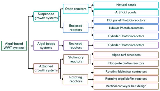 Depending on the environmental conditions, the effluent requirements and the specifics of the existing or newly designed WWTP, the studied algae-based wastewater treatment systems varied across a broad range of technological designs. Тhe treatment systems can generally be divided into three main groups—suspended, algal bead (active immobilization), and attached (passive immobilization) growth [39,40,41]. Each of these groups has specific reactor design variations (Figure 2).