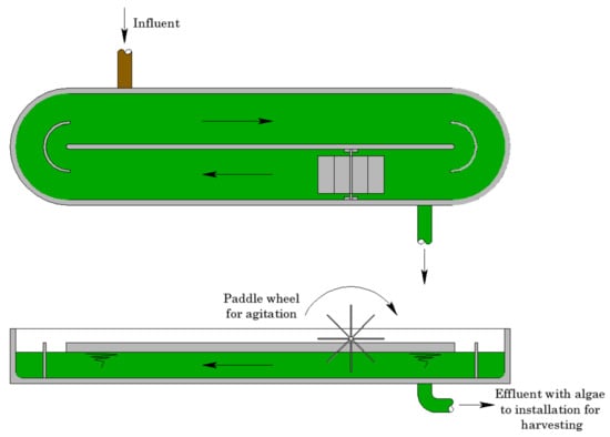 The open suspended algal growth reactors include natural or artificial ponds. Perhaps the most investigated reactor configuration is the High Rate Algal Ponds (HRAP) that are usually formed into Raceway ponds [31,40]. These reactor designs consist of artificially constructed water beds that function in a continuous or batch mode [39,42,43]. They are divided into parallel canals in which the wastewater–algae suspension reacts to achieve the full treatment process. Mixing is provided through a slowly revolving paddlewheel, creating a steady flow (approx. optimal flow velocity of 0.3 m s−1) throughout the system and is additionally assisted by the natural wind masses above the water surface (Figure 3) [44]. Microalgal cells are freely floating into the wastewater medium through the shallow ponds (0.15–0.50 m) [39,45,46]. These systems generally use natural solar illumination as a light source. The shallow depth of the HRAP allows the light to penetrate to all layers of the suspension. The algal biomass in these systems needs to be carefully monitored as internal shading inhibition might occur if hyper concentration of algae is reached in the reactor [43,47]. The HRAP reactors are preferred to the wastewater treatment realm, mainly because of the easy and inexpensive construction and operation [31,40].