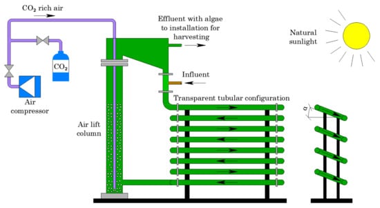 Enclosed tubular photobioreactor scheme adapted from Ting et al. 2017 [39].