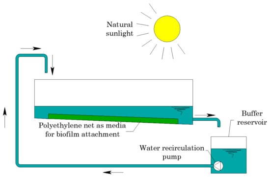 Stationary biofilm reactors use polymer mats for the carrier matrix and have no moving parts in their configuration. Wastewater is passed over the matrix on a thin layer so that the light can penetrate the system entirely and reach all algal cells [15,39,57]. The biofilm thickness is controlled by scraping [15,57]. The two main reactor configurations used in the literature are (1) Algae turf scrubbers (ATS) and (2) Flat-panel biofilm reactors [39]. ATSs (Figure 6) are usually open systems (canals) with 0.10 to 0.20 m of depth, resembling the open pond suspended growth reactors, but with a thin polymer matrix on the bottom [39]. These systems have a simplified operation but require extremely large amounts of area due to their reduced depth [46]. Flat-panel biofilm reactors are enclosed in single or twin-layer systems that have improved control and better utilization of the light but require all the additional installations for an enclosed reactor design, making their operation much more complicated [58].