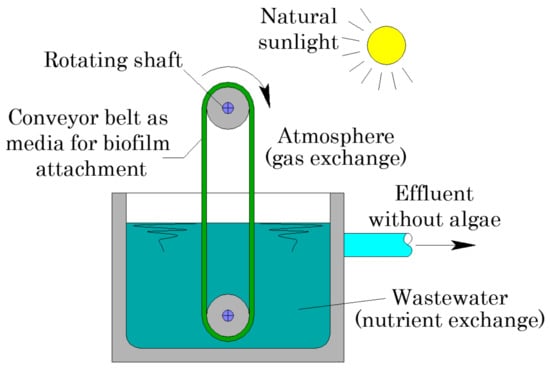 In order to save area and to achieve better light, substrate, and air transfer, rotating attached growth systems were developed [15,39,57,60]. In these reactors, the carrier matrix is attached to an electrically driven rotating shaft that interchanges the attached algae between the wastewater and the surrounding air medium [15,39,57,60]. The three main reactor types of this group use similar principles that are executed in various ways. They include: (1) Rotating biological contactors (RBC), (2) Rotating algal biofilm reactors (RABR), and (3) Vertical conveyor belt design (VCBD) [15,39,57,60]. RBCs resemble the biodiscs used for attached growth biological wastewater treatment with activated sludge, but are rarely used since they do not utilize the available light properly [15,39,57,60]. RABRs use natural (cotton, etc.) or synthetic (plastic polymer, etc.) ropes as an attachment matrix, which are wrapped around a rotating cylindrical drum. Excess algal biomass is harvested with the passing of the rope through an opening with a specific diameter, allowing for the maintenance of a constant thickness of the biofilm [15,39,57,60]. These systems perform better than the RBCs and are currently under development [15,39,57,60]. VCBDs use the same principle as RABRs but require lower footprints since the width of the canal for the placement of the conveyor belt is more narrow (Figure 7). This is achieved through the use of wider conveyor belts that provide the same amount of attachment area as a few revolutions of a thin rope around the drum of the RABR [15,39,57,60]. The biomass is directly scraped at the top of the conveyor belt with a paddle [15,39,57,60]. This is perhaps the most promising patented technological design reactor configuration for the attached growth algae-based wastewater treatment.