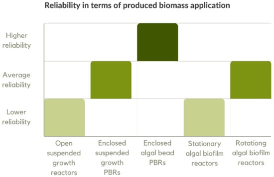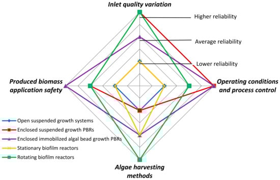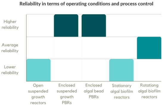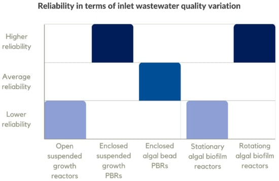 Estimation of the reliability of the available algae-based wastewater treatment reactor configurations regarding the process stability, with respect to the wastewater quality variation, is graphically presented in Figure 8.
