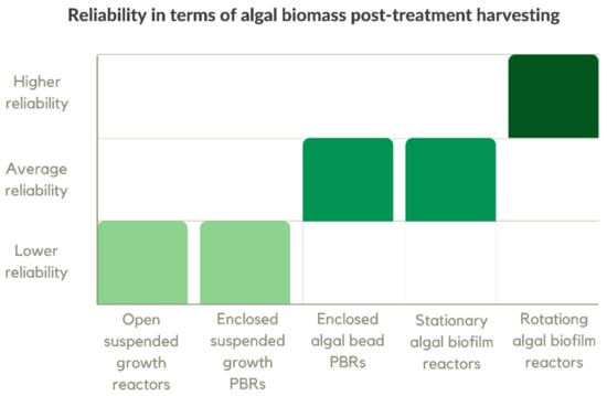The estimated reliability of the algae-based wastewater treatment technologies in terms of the maintenance of stable operating conditions and process control is shown in Figure 9.