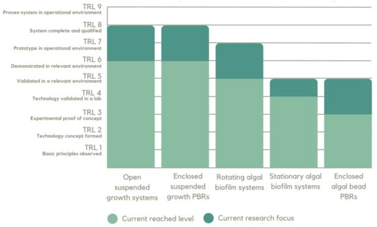 Despite the high number of worth-to-be-considered advantages and the great amount of time for their development, these technologies are still not applied in an operational environment [24]. This paper seeks to identify the main reasons for the failure to reap the benefits of the algae-based technologies for N and P removal and recovery in municipal WWTPs. Two main aspects are discussed: the reliability of the developed technologies and their readiness level. Based on the review of the research achievements and the targeted comprehensive analysis, the paper concludes on the research prospects.