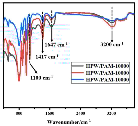 Figure 1 presents the FTIR spectra of the HPW/PAM-10000, HPW/PAM-15000 and HPW/PAM-20000 catalysts. All catalysts showed two different peaks at 1417 cm−1 and 1647 cm−1. Whereas 1647 cm−1 was the bending vibration peak of N-H, 1417 cm−1 was the absorption peak of the methylene group (amide portion of the polymer). The 1100 cm−1 peak was the stretching vibration of C-H. There was a broad peak (3200 cm−1), which was a hydrated molecular O-H bond of heteropoly acid. The -NH2 vibration peak was lost because the hydrated molecule of the heteropoly acid vibration peak obscured the amine group vibration peak. Figure 1 indicates the polymer catalyst was successfully synthesized.