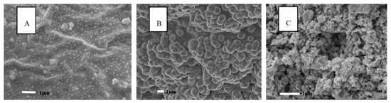 SEM images of (A) HPW/PAM-10000, (B) HPW/PAM-15000 and (C) HPW/PAM-20000.