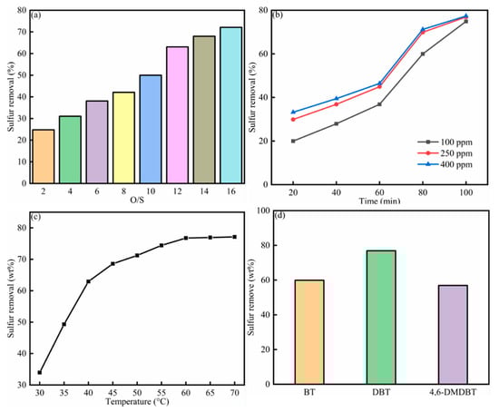 The different oxygen to sulfur ratio, initial sulfur content, temperature and sulfur compounds effect by HPW/PAM-10000 on desulfurization efficiency is shown in Figure 4. As shown in Figure 4a, the HPW/PAM-10000 desulfurization efficiency increased with the increase of O/S. When the O/S was 16, the desulfurization efficiency remained stable, which was because liquid sealing hindered the reaction under high water content. As shown in Figure 4b, the HPW/PAM-10000 desulfurization efficiency increased when the reaction time increased. When the initial sulfur content increased, the desulfurization efficiency increased because the contact area between oxygen molecules and sulfur compounds increased at the high sulfur content. When the initial sulfur content was higher than 250 ppm, the desulfurization increased slightly. As shown in Figure 4c, when the temperature increased from 30 °C to 60 °C, the HPW/PAM-10000 desulfurization efficiency increased from 37.5% to 76.9%, which can be attributed to the increase of the decomposition rate of hydrogen peroxide with higher temperature, enabling oxygen molecules to effectively react with sulfur compounds. As shown in Figure 4d, the desulfurization efficiency was DBT > BT > 4, 6-DMDBT. Different sulfur compounds have different electron clouds densities and spatial resistances, and the reaction rate between sulfur and oxygen molecules was different.