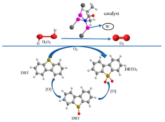 As shown in Figure 6, phosphotungstic acid was a good catalyst for oxidative desulfurization. Its active center can decompose hydrogen peroxide as water and oxygen. Then, its active center W can act to transport oxygen molecules, transporting oxygen molecules to specific locations for reaction. Of course, the W valence state of the event center will also change [36,41]. When an oxygen molecule was successfully transported and reacted with the sulfur compound, its valence returned to its original valence state, and the process was repeated until all oxygen molecules were transported. At this time, the sulfur compound was also oxidized to a sulfone or sulfoxide. The polarity of the sulfone or sulfoxide was greatly different from the polarity of the aromatic sulfur compound, and the sulfur oxide could be easily extracted.