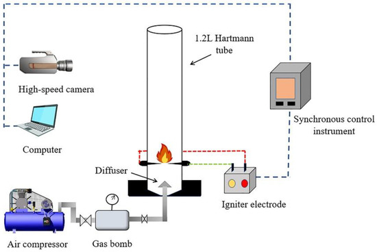 The experimental system consisted of 1.2 L Hartmann apparatus, high-speed photography system, high-pressure ignition system and data acquisition system, as shown in Figure 1. 1.2 L Hartmann apparatus can provide ignition energy from 0.1 mJ to 1000 mJ, the ignition method is electric spark ignition, the inductance of the discharge circuit is 1 mH, and its main body is a vertically placed quartz glass tube, 300 mm high, circular cross-section, with a cross-section radius of 35.7 mm. It has the advantages of small size, easy disassembly, easy cleaning of combustion residue, short experiment time among others.