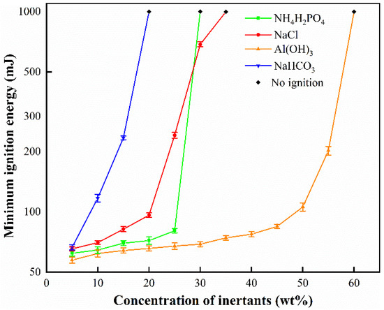 As shown in Figure 2, NaHCO3, NH4H2PO4, NaCl and Al(OH)3 with particle sizes of 25–37 μm were selected as the inert powders and mixed with sucrose for ignition experiments, and the ignition energy change patterns in the four groups of dusts were obtained. After the addition of the inert powder, the MIE of sucrose increased, and with the increase in mass fraction of the inert powder, the MIE of all four groups of dusts increased monotonically. The data curves in the last interval all showed a sharp increase, reaching the critical state of fully suppressing the sucrose dust, which indicated that NaHCO3, NH4H2PO4, NaCl and Al(OH)3 all have an inhibitory effect on the MIE of sucrose dust [27,28].