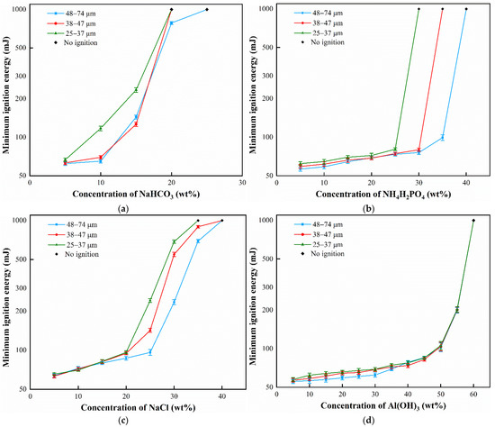 Effect of four inert powders with different particle sizes on sucrose MIE. (a) NaHCO3; (b) NH4H2PO4; (c) NaCl; (d) Al(OH)3.