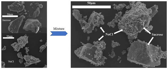 As shown in Figure 6, NaCl was added to the sucrose dust, and after thorough mixing, the NaCl was dispersed around the sucrose dust. Due to the phenomenon of particle agglomeration, many NaCl fragments passed through the standard sieve, along with the large particles, to become the experimental sample. After stirring and mixing, many NaCl fragments were transferred to the sucrose particles and covered the surface of them. After the formation of the combustion flame, the heat conduction rate of the flame front and the intensity of thermal radiation of the combustion particles can be effectively attenuated. On the one hand, the NaCl particles adhere to the sucrose particle surface; these dispersed NaCl powders act as a barrier similar to the low temperature. On the other hand, the surface of the NaCl particles become wet after absorbing water vapor, and the wet surface absorbs more ignition energy, so the remaining ignition energy doesnot ignite the mixed dust.
