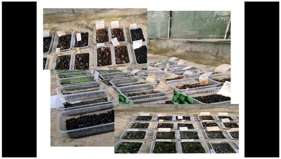Sludge from municipal WWTP in Blagoevgrad was used. The wastewater treatment technology included mechanical and biological stages. The sludge underwent thickening, anaerobic stabilization in open digesters, dewatering in belt filter presses, and, finally, deposition to sludge drying beds. Sludge (initial indicators: pH = 6.23; water content 90%, t = 30 °C) obtained from the belt filter presses of the WWTP-Blagoevgrad was studied according to microbiological indicators, in dynamics, composted in greenhouse conditions (air temperature: t-day = 28–30 °C, t-night = 17–18 °C; air humidity: 50–60%), in plastic packages (containers) from 2 L, and treated with quicklime and ash in different concentrations. For some of the variants, fertilization with microbial fertilizer (Baikal EM-1) containing lactic acid and photosynthetic bacteria, nitrogen-fixing bacteria, and Saccharomyces was applied. Each package contained 100 g of dry matter, comprising: 10 g CaO (“Sludge + 10% CaO”), 20 g CaO (“Sludge + 20% CaO”), 30 g ash (“Sludge + 30% ash”), 50 g ash (“Sludge + 50% ash”), and 100 mL of diluted microbial fertilizer solution (for all variants with microbial fertilizer). In laboratory conditions, the sludge samples were placed in different temperatures and aerobic and anaerobic conditions for different periods of time before their analysis. The scheme of variants and the period of microbiological analysis are presented in Table 1a,b, and the composting of the variants in greenhouse conditions is illustrated in Figure 1.