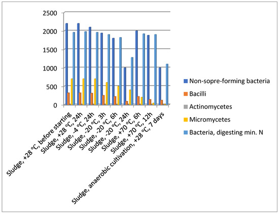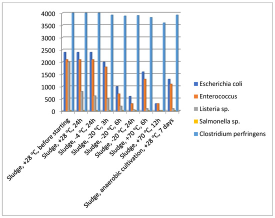 At negative and higher positive (70 °C) temperatures, mesophilic microorganisms stopped their development and activity, and psychrophiles and thermophiles (which are less than mesophiles) actively developed in samples cultured at 28 °C. Thermal treatment (100 and 130 °C) without adjuvants reduced microbiological contamination in the sewage sludge [19]. By lowering the temperature to −20 °C and prolonging the cultivation time, the number of microbes decreased. An exception to this trend was found for Clostridium; their amount was lower at −20 °C for 6 h compared with the same temperature for 24 h, which is explained by their mechanisms for adaptation to environmental conditions. Anaerobic microorganisms were fewer than aerobic ones, with the exception of Clostridium perfringens, which are anaerobes, and lactobacilli, which are microaerophiles. Placing the samples at extreme temperatures and in an oxygen-free environment before analyzing reduces the development of pathogens but does not destroy them. The amount of Clostridium perfringens depends least on the influence of extreme temperature conditions, as they are spore-forming and can better adapt and survive changes.