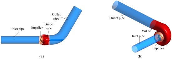 A 3D schematic diagram of (a) mixed-flow pump with guide vanes and (b) mixed-flow pump with a volute.