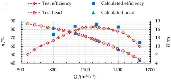 Comparison of test and calculated results of the mixed-flow pump with a volute.