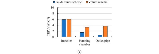 Figure 9 shows a comparison of the TEP between the mixed-flow pump with guide vanes and a volute under three flow rates. Since the inlet pipe was located upstream of the pumping chamber and impeller, the TEP of the inlet pipe was low and not affected by the type of pumping chamber. Although the impeller was also located upstream of the pumping chamber, the TEP of impeller were different in two types of mixed-flow pump due to the fact that interference effect between the impeller and pumping chamber was closely related to the type of pumping chamber. In addition, the type of pumping chamber and the operating flow rate played key roles in the TEP of the pumping chamber and outlet pipe. Under Q = 800 m3/h, there is little difference in the TEP between the volute and the guide vanes due to the similar ability to recover rotational kinetic energy. The TEP of the impeller and outlet pipe in the mixed-flow pump with guide vanes is higher than that with a volute. The relative deviations of the impeller and outlet pipe between the mixed-flow pump with guide vanes and a volute were 3.2% and 360.2%, respectively. Under Q = 1200 m3/h, the TEP of the impeller, pumping chamber and outlet pipe in the mixed-flow pump with guide vanes is higher than that with a volute. The relative deviations of impeller, pumping chamber and outlet pipe between the mixed-flow pump with guide vanes and a volute were 1.3% 22.4% and 63.0%, respectively. Under Q = 1600 m3/h, the TEP of the impeller, pumping chamber and outlet pipe in the mixed-flow pump with guide vanes is lower than that with a volute caused by that the guide vanes have a higher ability to recover rotating kinetic energy under large flow rates. The relative deviations of impeller, pumping chamber and outlet pipe between the mixed-flow pump with guide vanes and a volute are −2.2% −54.7% and −82.7%, respectively.