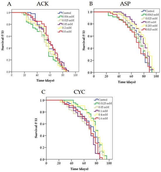 Effect of ASP (A), ACK (B) and CYC (C) supplementation on the lifespan of Drosophila melanogaster.
