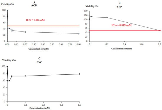 Cytotoxic effects of ACK (A), ASP (B) and CYC (C). Viability curves at 72 h of treatment.