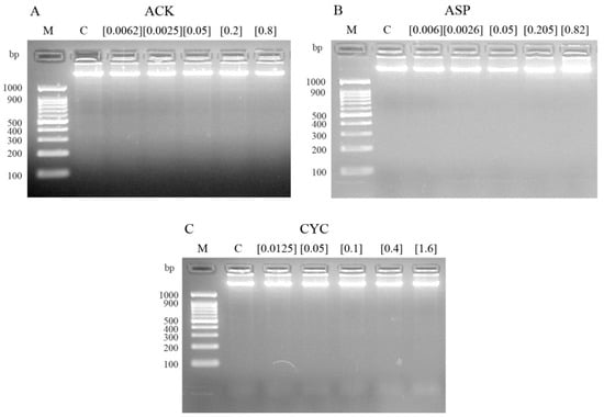 Internucleosomal DNA fragmentation after 5 h of treatment with ACK (A), ASP (B) and CYC (C). Letters M and C mean weight size marker and negative control, respectively. Moreover, the different concentrations tested for the three compounds are indicated in each sample well.
