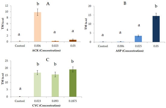 Alkaline comet assay (pH < 13) of HL-60 cells after 5 h-treatment with different concentrations of ACK (A), ASP (B) and CYC (C). DNA migration is reported as mean TM. The plot shows mean TM values and standard errors. Different letters mean different values after one-way ANOVA and post hoc Tukey’s test.