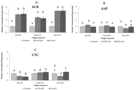 Relative normalised expression data of each repetitive element when HL-60 cell line was treated with ACK (A), ASP (B) and CYC (C). Different letters are associated with different means applying the One-Way ANOVA test and post hoc Tuckey’s test.