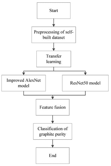 The innovations of this paper are as follows: (1) using data augmentation (brightness enhancement, contrast enhancement, horizontal rotation and random direction rotation) to solve the problem of model classification for small sample data; (2) the feature of the image is extracted using the migration learning algorithm, which greatly shortens the training time of the model; (3) building the optimized model of double-channel weighted fusion network of AlexNet and ResNet50. The flowchart of the graphite purity identification algorithm is shown in Figure 1.