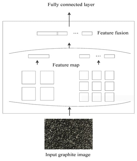 At present, with the continuous expansion of the application field of graphite, its purity required to become higher and higher. Graphite itself is a natural elemental crystalline mineral of carbon, and the fixed carbon content is the main index of graphite purity [5]. According to the fixed carbon content, it can be divided into four categories: high-purity graphite (); high-carbon graphite (); medium-carbon graphite (); and low-carbon graphite (). Graphite purity measurement detects the proportion of fixed carbon content in graphite. Graphite has good chemical stability at room temperature, so it is not convenient to directly determine its carbon content. Generally, high-temperature volatilization of materials to be tested is used to calculate the carbon content. This method has high time cost and low accuracy, due to the need for manual identification. With the increasing importance of image processing, analysis and application in the mining field, the deep convolution neural networks (CNN) structure is used in many recognition applications to achieve high recognition accuracy [6]. CNN contains high-level semantic information and middle-level details, which can improve the accuracy of recognition. Therefore, the model proposed in this paper is based on CNN architecture. The samples with different purity of graphite have little difference, so it is necessary to train a deeper network layer to improve the accuracy of graphite recognition. However, the design of a deep network can produce a large number of redundant parameters, even overfitting problems, while a shallow network with fewer parameters is not enough to learn the graphite’s feature representation. Therefore, the combination of multiple features provides the possibility to solve this problem. Compared with a single feature type, the combination of multiple features has better performance [7]. At present, multi-model fusion is widely used in classification and recognition. Li et al. weighted the Local Binary Pattern (LBP) features and the features extracted from Visual Geometry Group 16 (VGG16) network, then fused the features to complete six kinds of expression classification [8]; Brahimi et al. solved the problem of tomato leaf disease recognition by using the existing CNN model pre-trained by AlexNet and Google LeNet (GoogLeNet) [9]. Although image recognition technology continues to develop and improve with the progress of science and technology, the relevant recognition of graphite still adopts physical and chemical methods such as manual recognition and microscope recognition. At present, there is little research on the image recognition of graphite purity. In particular, the difficulty of graphite data collection and the strong professionalism of graphite research also lead to the difficult development of intelligent recognition of graphite. Generally speaking, measuring the proportion of fixed carbon content in graphite can achieve the purpose of detecting its purity, but graphite has excellent chemical stability at room temperature. The steps of directly determining its carbon content are cumbersome and the requirements of the measurement environment are high. Based on this, at present, the purity measurement of graphite is mostly calculated by high-temperature volatilization, that is, according to the volatilization value when graphite is oxidized to carbon dioxide at high temperature. Although this method reduces the difficulty of measurement, it takes a long time and has low manual recognition accuracy. The convolution neural network based on migration learning enables rapid, efficient recognition of graphite purity. Therefore, the realization of automatic identification of graphite purity is of great significance to the development of the graphite field. Based on this, combined with transfer learning, this paper improves the classical CNN network to accelerate the convergence of the model, save time and cost, and realize the intelligent recognition of the graphite image.