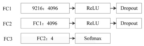 In the full connection layer, dropout is used to randomly ignore some neurons, which can effectively solve the overfitting problem and improve the overall robustness of the model. Finally, the final classification layer of Softmax nonlinear is used, and the final output is set to 4. The optimized AlexNet output module is shown in Figure 8.