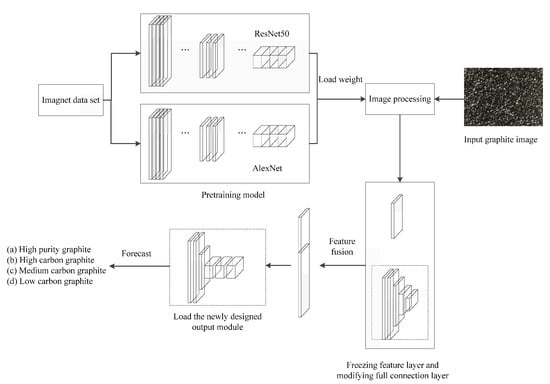 Transfer learning refers to the process of using models that have been trained for different tasks, hoping that the model can have enough generalized information to solve new specific tasks [12]. Transfer learning uses a huge database of pre-training models (CNN models) to help learn target tasks [13,14,15,16]. In the application of this transfer learning technology, large image data mostly belong to the general images field, such as those of a cat, dog or chair. The image in this paper is graphite, which has a different visual performance. The visual performance learned from these large images may not be able to represent graphite images well. Therefore, we need to modify the pre-trained CNN structure to adapt to our task. Donahue, Zeiler and Fergus provide evidence that the general image representation learned from the pre-trained CNN is superior to the most advanced hand-made features [17,18].