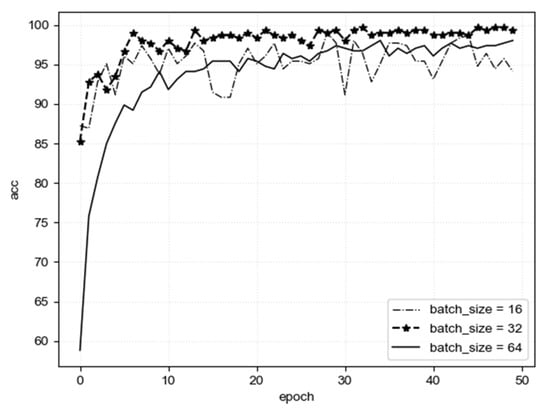 In order to make the parameters of the algorithm relatively optimal, this paper analyzes different batch_sizes, and the results are shown in Figure 11. When the batch_ size is 16, the accuracy fluctuates greatly and the robustness of the whole model is not strong, when the batch_size is 32 and 64, the accuracy fluctuates less and improves faster, and when the batch_size is 32, the model converges quickly. At the same time, considering the accuracy and convergence rate, this paper finally selects the batch_ size as 32.