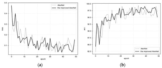 It can be seen from Figure 12 that the optimized AlexNet makes the network more stable. After modifying the activation function, with the increase in epoch, the loss value decreases rapidly, and the accuracy rate improves slightly, which verifies the effectiveness and feasibility of the optimized AlexNet. The comparative loss and accuracy rate are shown in Table 2.