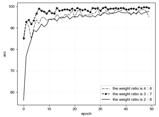In order to verify the role of optimized AlexNet and ResNet50 in graphite purity feature representation, experiments were carried out to give different weights to the data set, and the accuracy of graphite recognition was recorded. The results are shown in Figure 13. It can be seen that when the weight ratio of the features extracted by AlexNet and ResNet50 is 3:7, the recognition accuracy fluctuates little, and the accuracy is relatively optimal, so the final weight ratio is 3:7.