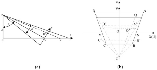 The position relationship between the image plane and the ground can be obtained from the spatial position relationship between the image plane coordinate system and the ground coordinate system in the camera imaging model, as shown in Figure 3a,b. Point Q in Figure 3a corresponds to any point on the plane ABCD, its plane coordinate was (Qx, Qy); Q’ is a point on the image plane corresponding to point Q, and its coordinate was (Qu, Qv). The corresponding relationship between pavement coordinate and image points can be established using the collinear principle of actual point Q, image point Q’, and camera optical center point Z, as indicated in Formula (4).