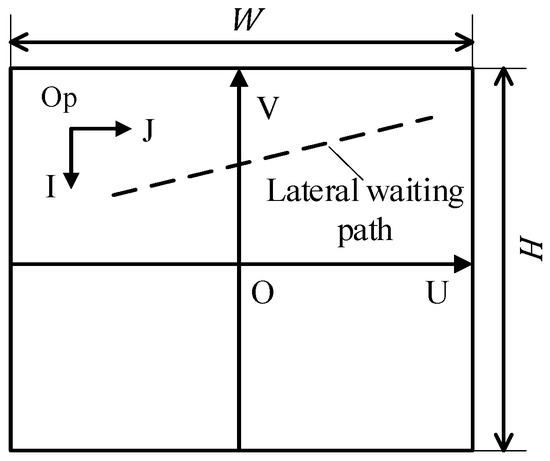 As shown in Figure 4, the known image resolution was H × W. The position parameter slope and intercept of the turning path in the pixel coordinate system I-O-J were αp and βp, respectively. Then, using the relative position relationship between the pixel coordinate system and the image coordinate αt and intercept βt, we were able to calculate the slope of the position parameter of the turning path in the equivalent picture plane as follows: