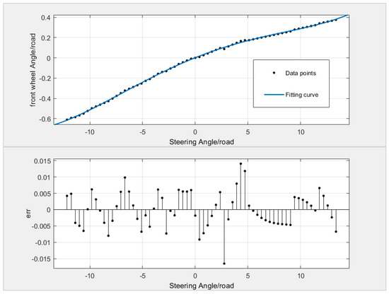 A turning control method based on vehicle turning path prediction was devised on the basis of the path acquisition features of a vehicle navigation system based on machine vision. First, the turning trajectory of the vehicle is anticipated on the basis of the vehicle structure size, front-wheel adjustment parameters, and driving speed. Then, the relative position of the vehicle trajectory in the waiting turning path is determined on the basis of the CCD camera and the steering point. When the vehicle reaches the steering point, the steering wheel angle is adjusted to control the vehicle in order to drive to the predetermined waiting turning path. The angle sensor [53] used to measure the front-wheel rotation angles corresponding to different steering wheel angles is shown in Table 2, and the relationship between steering wheel rotation and front-wheel deflection is fit using the MATLAB data fitting tool. The relationship is shown in Formula (10), and the diagram is shown in Figure 5.