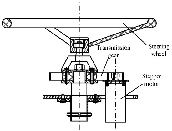 The test object’s steering actuator is a stepping motor gear packing actuator. The structure is shown in Figure 6. It mainly uses a stepping motor as a power source to drive the steering wheel through a gear transmission to realize the front-wheel steering control. The working speed of the stepper motor was 5.3 rad/s, and the gear ratio was 1:4, and therefore the adjustment speed of the steering wheel was 1.33 rad/s. Simultaneously, the front and rear wheelbase l of the vehicle was measured to be 3.25 m, and the maximum deflection angles of the left and right front wheels were 35° and 21°, respectively.
