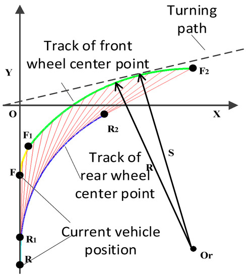 We set the turning path expression to y = αx + β, according to the positional relationship when the vehicle trajectory is tangent to the transverse road to be turned when the distance s between the vehicle rotation circle center Or and the turning path in the F1F2 stage are equal to the current vehicle radius r, being the best turning point of the vehicle. The calculation formulas of S and R are as follows: