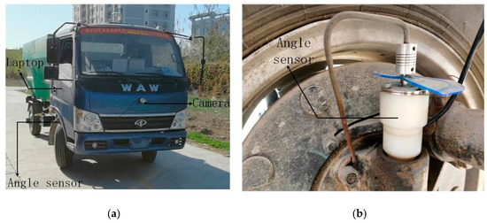 To verify the feasibility of the vehicle turning control algorithm proposed in this paper, on the basis of the path detection algorithm developed in the early stage, we integrated the steering control algorithm designed in this paper. The industrial computer used was a Lenovo laptop, CPU was i7 6700HQ, memory was 8 G, and the graphics card was GTX960M; VS2013 MFC software development program was used to write the vehicle turning control program. The program interface during the experiment is shown in Figure 9, showing that the camera interface was corrected for distortion, and the red guide line was the path navigation line. The program was mainly composed of three parts: vehicle status, serial port setting, and image source selection. The vehicle status includes four parameters: vehicle deflection angle, front wheel deviation, front wheel deflection angle, and adjustment angle, which were calculated by the data transmitted by the program and sensor. We build a test platform with agricultural vehicles as the test object. Sensors, cameras, laptops, and other equipment were placed and installed as shown in Figure 10a,b, and the industrial computer was placed in the passenger seat. In September 2019, the navigation test site of the North Campus factory of Shihezi University in Xinjiang was used for obtaining the turning path position and vehicle turning test.