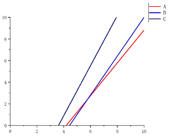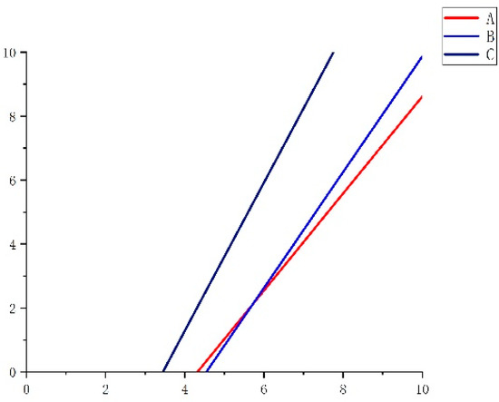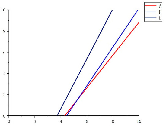According to the relationship between the measured position and the actual position of path A for α and β, the errors were −0.012 and 0.0985, respectively. Similarly, for path B α and β, the errors were −0.008 and 0.1193, respectively. For path C α and β, the errors were −0.004 and 0.0686, respectively. It is known that the greater the angle between the transverse path and the longitudinal path, the smaller the slope error, and the algorithm can meet the requirements of vehicle turning.