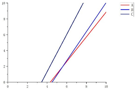 During the test, the vehicle was first guided to the early longitudinal path on the basis of the straight-line path tracking algorithm developed in the early stage. Setting Cartesian coordinates at the test site, we recorded the turning track when the vehicle was turning. We found the best turning point according to Formulas (8) and (9). The tangent of the best turning point fell on the established coordinate axis, and the actual measured value was obtained. Then, the path blocking method was adopted to conduct tests on turning paths A, B, and C according to the length of the front bridge. We recorded the vehicle steering motion at the beginning of the path location of turning parameters of CCD camera measurement (slope alpha and intercept beta) and compared it with the actual value; the vehicle turning control accuracy took place at the same time at the front axle length of 1.72 m, with the results being shown in Table 3. At the same time, we obtained the turning path measuring position and actual position parameters of a function, which are shown in Figure 12 and Figure 13. When the front axle length was 1.43 m, the experimental results were as they are shown in Table 4. At the same time, the one-time function of measured position parameters and actual position parameters of the turning path was obtained, as shown in Figure 14 and Figure 15.