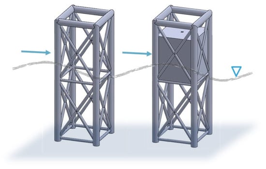 By generally following the associated study [], this part of the research of an OWC wave energy converting system integrated with an offshore jacket platform was studied experimentally. The purposes of this study will focus on the effectiveness of the OWC system in the open sea, as the one in the study is built on an offshore template structure, and, furthermore, to examine the possibility for improving the effectiveness of the traditional wave converting system. Since this has already been verified for the OWC system located at the shoreline [], and the stress exerting on the structure could be enormous and may cause severe damage to the structure, the current stage of research of the complicated types of OWC systems that may induce larger wave forces are not considered.