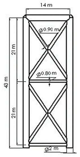 Figure 2 [] shows the side view of the jacket-type structure. The dimensions for the structure and the size of the structural members are also shown in the figure, where the height of the offshore template infrastructure is 43 m above the seabed and the width of the square platform is 14 m. The diameters of the cylinder members are: 2 m for the vertical members and the top frames, 0.9 m for the inclined members, and 0.8 m for the horizontal members.