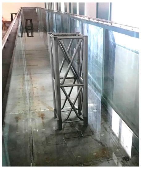 After consideration for the largest model that can be tested in the water tank—which is 35 m long, 1 m wide, and 1.2 m height—the testing condition of the water is set between 0.5 m to 0.8 m. Given that the water depth for the location of the prototype structure is assumed to be 15 m, the water depth for the testing model is about 0.6 m and, therefore, a model with a scale ratio of 1/36 is proposed and built. Accordingly, all the dimensions of the model structure are built with the same scale ratio. The complete scaled-down model for the experimental test located in the water tank from various angles of observation is shown in Figure 3.
