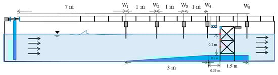 The set-up of the experimental facilities and measuring system are shown in Figure 4, where the observed five meters (w1–w5) for the wave height were installed along the designed spacing. It is noted that in the schematic drawing the OWC converting chamber is not installed and, once the OWC is set up, the speed meter will be put in the outlet opening of the chamber. Figure 5 shows the photograph of the testing model installed with the measuring system.